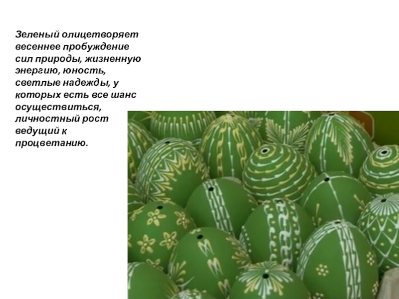 Зеленый олицетворяет весеннее пробуждение сил природы, жизненную энергию, юность, светлые надежды,