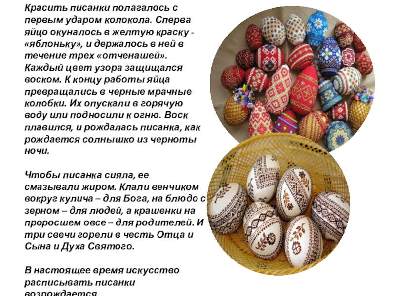 Слайд 17Красить писанки полагалось с первым ударом колокола. Сперва яйцо окуналось в