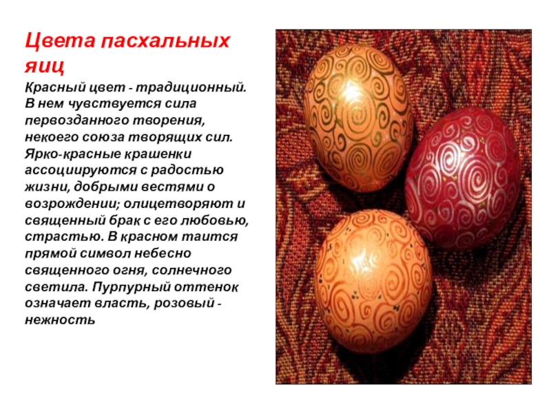 пасхальные яйца в красные и багряные оттенки, приближая их по цвету к горячему солнечному светилу. Но вместе с тем использовали и другие тона, причем каждый из них нес в себе определенную смысловую нагрузку.
