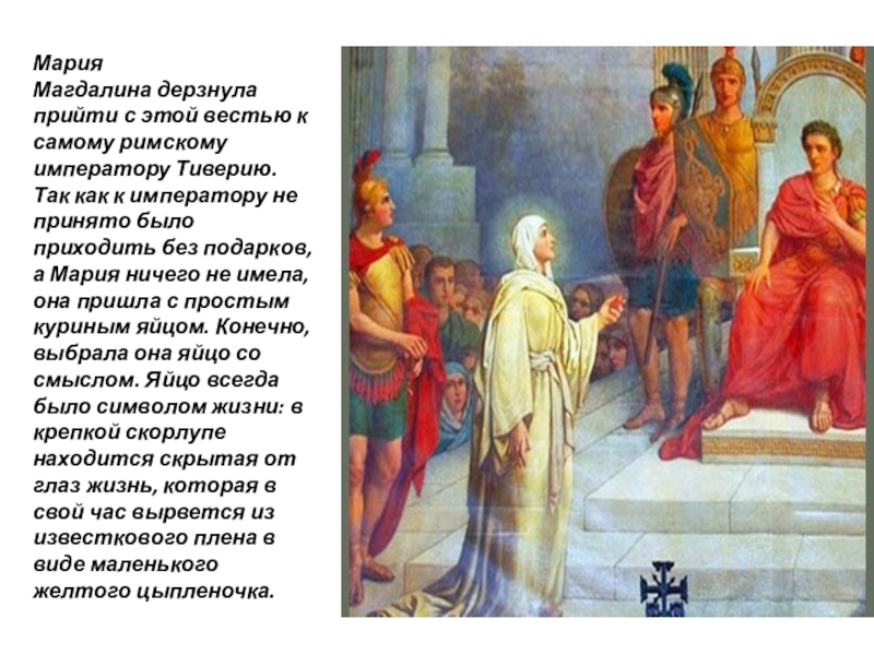 Слайд 3Мария Магдалина дерзнула прийти с этой вестью к самому римскому императору Тиверию.