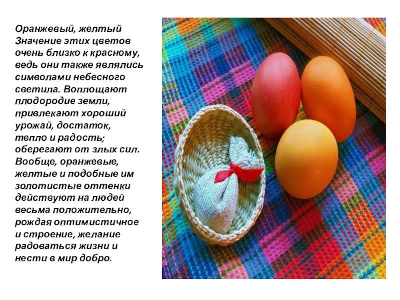 символами небесного светила. Воплощают плодородие земли, привлекают хороший урожай, достаток, тепло и радость; оберегают от злых сил. Вообще, оранжевые, желтые и подобные им золотистые оттенки действуют на людей весьма положительно, рождая оптимистичное и строение, желание радоваться жизни и нести в мир добро.