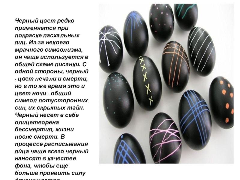 Черный цвет редко применяется при покраске пасхальных яиц. Из-за некоего мрачного символизма,
