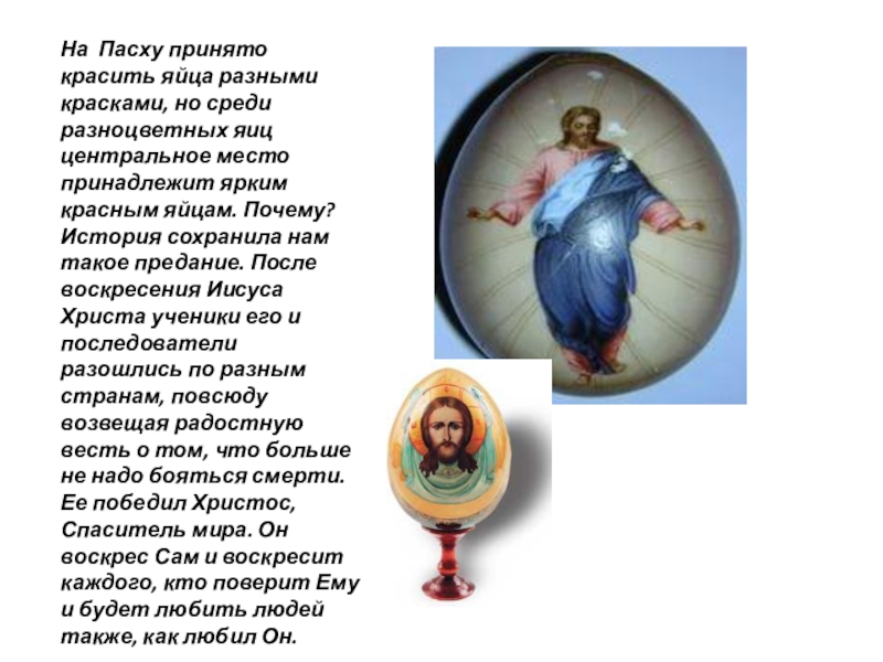 место принадлежит ярким красным яйцам. Почему? История сохранила нам такое предание. После воскресения Иисуса Христа ученики его и последователи разошлись по разным странам, повсюду возвещая радостную весть о том, что больше не надо бояться смерти. Ее победил Христос, Спаситель мира. Он воскрес Сам и воскресит каждого, кто поверит Ему и будет любить людей также, как любил Он.