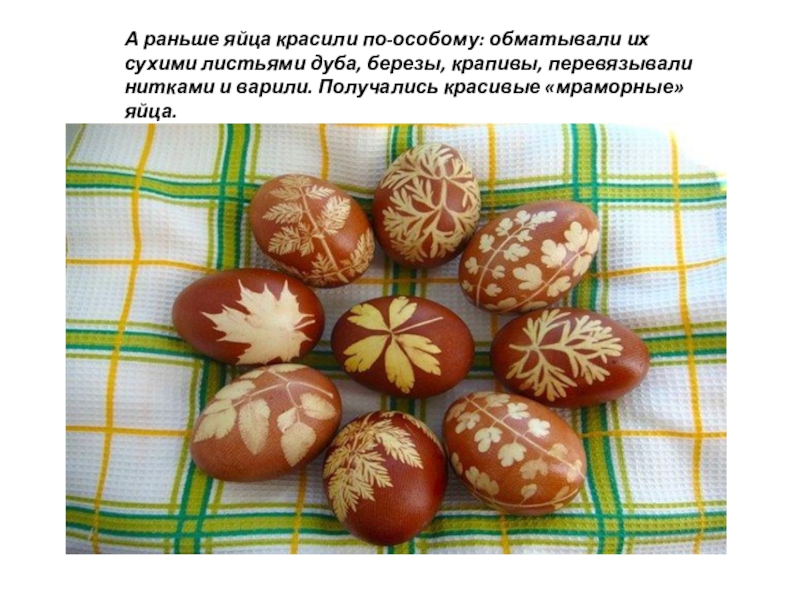 Слайд 6А раньше яйца красили по-особому: обматывали их сухими листьями дуба, березы,