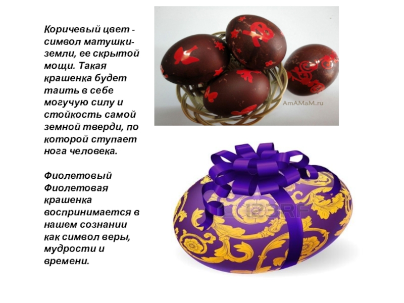 Слайд 13Коричевый цвет - символ матушки-земли, ее скрытой мощи. Такая крашенка будет