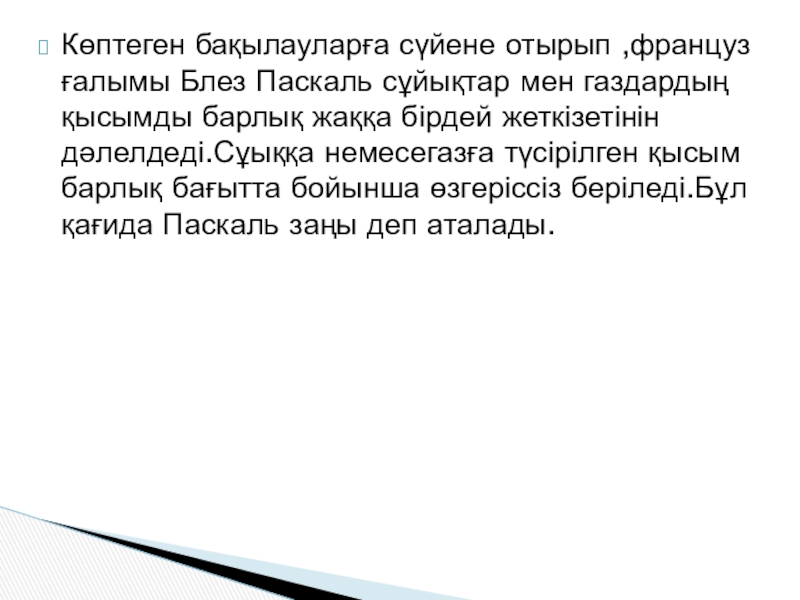 Слайд 5Көптеген бақылауларға сүйене отырып ,француз ғалымы Блез Паскаль сұйықтар мен газдардың