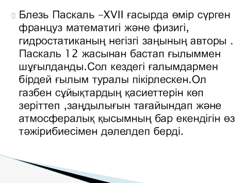 Слайд 8Блезь Паскаль –XVII ғасырда өмір сүрген француз математигі және физигі,гидростатиканың негізгі