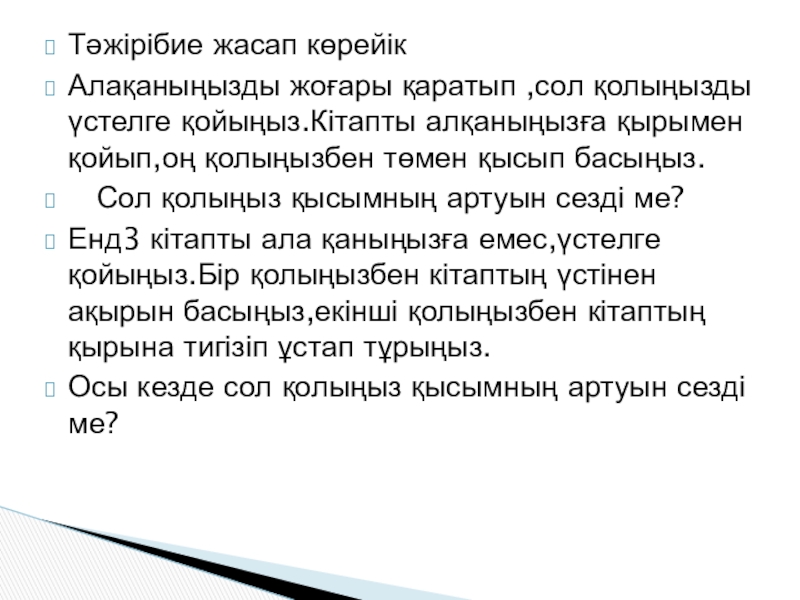Тәжірібие жасап көрейікАлақаныңызды жоғары қаратып ,сол қолыңызды үстелге қойыңыз.Кітапты алқаныңызға қырымен қойып,оң қолыңызбен төмен қысып басыңыз.