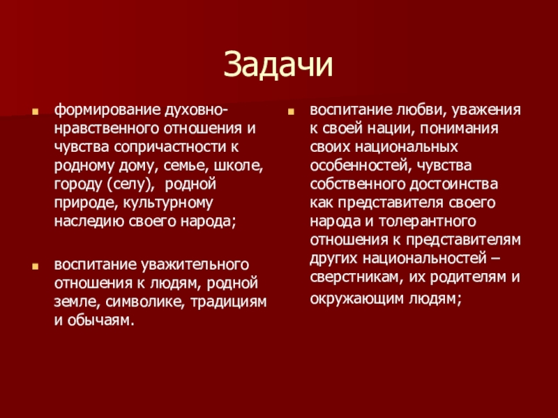 воспитание любви, уважения к своей нации, понимания своих национальных особенностей, чувства собственного достоинства как представителя своего народа и толерантного отношения к представителям других национальностей – сверстникам, их родителям и окружающим людям;