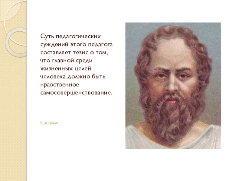 Слайд 10Суть педагогических суждений этого педагога составляет тезис о том, что главной