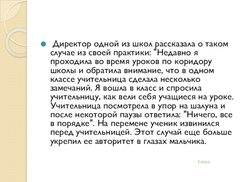 своей практики: "Недавно я проходила во время уроков по коридору школы и обратила внимание, что в одном классе учительница сделала несколько замечаний. Я вошла в класс и спросила учительницу, как вели себя учащиеся на уроке. Учительница посмотрела в упор на шалуна и после некоторой паузы ответила: "Ничего, все в порядке". На перемене ученик извинился перед учительницей. Этот случай еще больше укрепил ее авторитет в глазах мальчика.