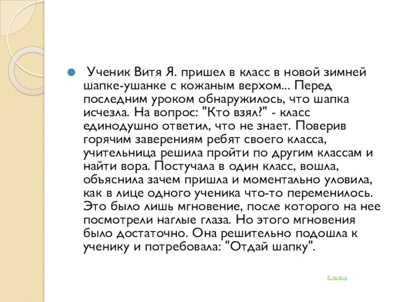 шапке-ушанке с кожаным верхом... Перед последним уроком обнаружилось, что шапка исчезла. На вопрос: "Кто взял?" - класс единодушно ответил, что не знает. Поверив горячим заверениям ребят своего класса, учительница решила пройти по другим классам и найти вора. Постучала в один класс, вошла, объяснила зачем пришла и моментально уловила, как в лице одного ученика что-то переменилось. Это было лишь мгновение, после которого на нее посмотрели наглые глаза. Но этого мгновения было достаточно. Она решительно подошла к ученику и потребовала: "Отдай шапку".