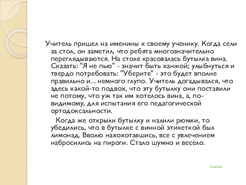 за стол, он заметил, что ребята многозначительно переглядываются. На столе красовалась бутылка вина. Сказать: "Я не пью" - значит быть ханжой; улыбнуться и твердо потребовать: "Уберите" - это будет вполне правильно и... немного глупо. Учитель догадывался, что здесь какой-то подвох, что эту бутылку они поставили не потому, что уж так им хотелось вина, а, по-видимому, для испытания его педагогической ортодоксальности.