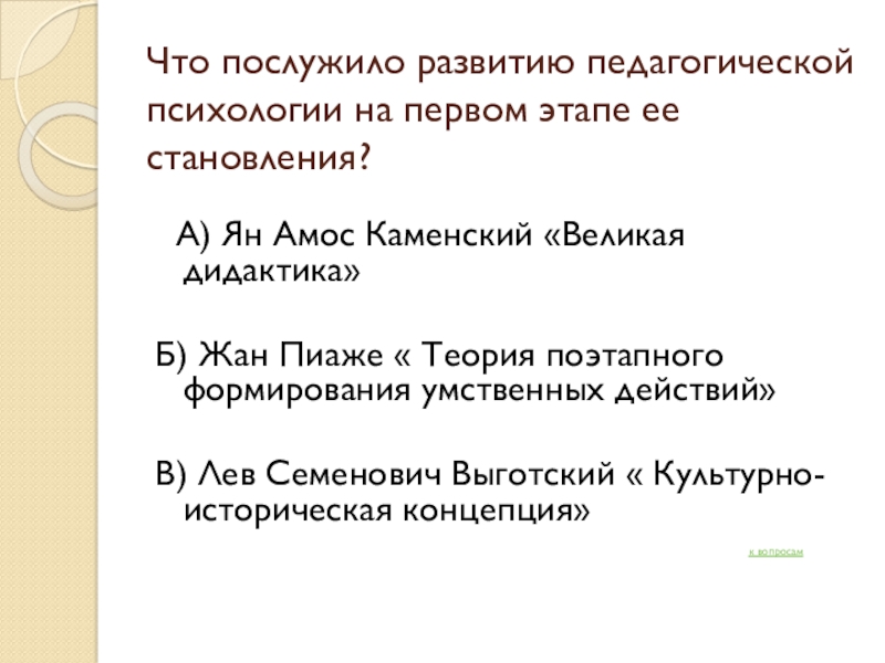 Слайд 7Что послужило развитию педагогической психологии на первом этапе ее становления?
