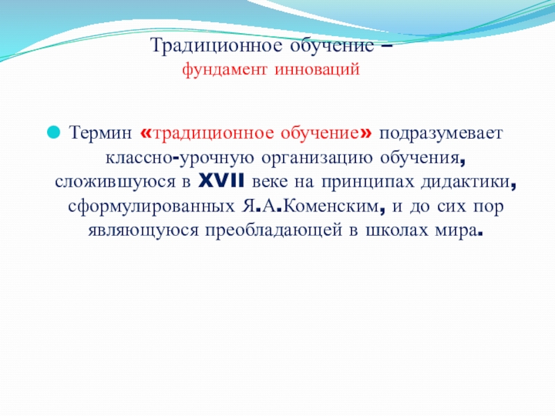 Слайд 12Термин «традиционное обучение» подразумевает классно-урочную организацию обучения, сложившуюся в XVII веке