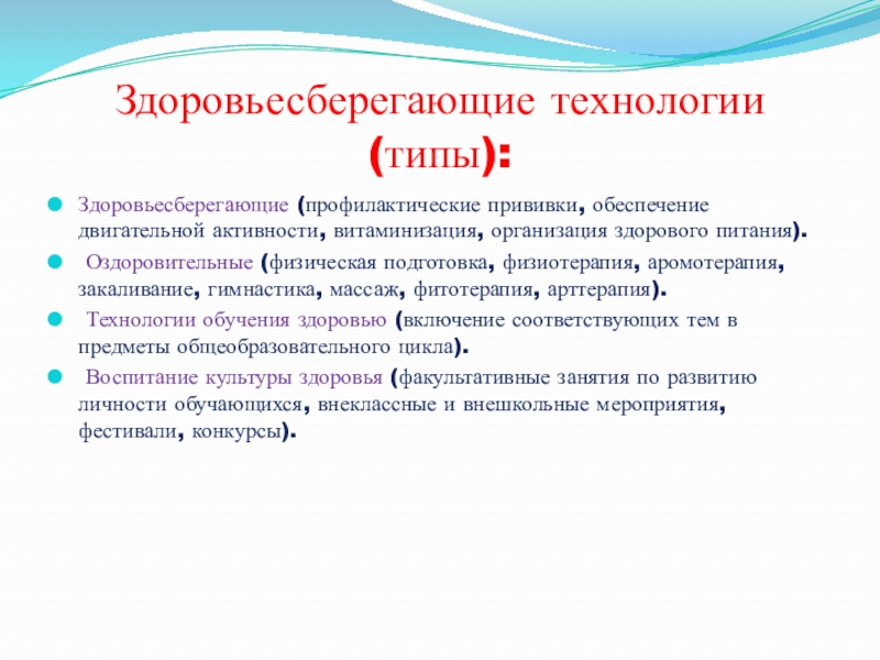 Оздоровительные (физическая подготовка, физиотерапия, аромотерапия, закаливание, гимнастика, массаж, фитотерапия, арттерапия).