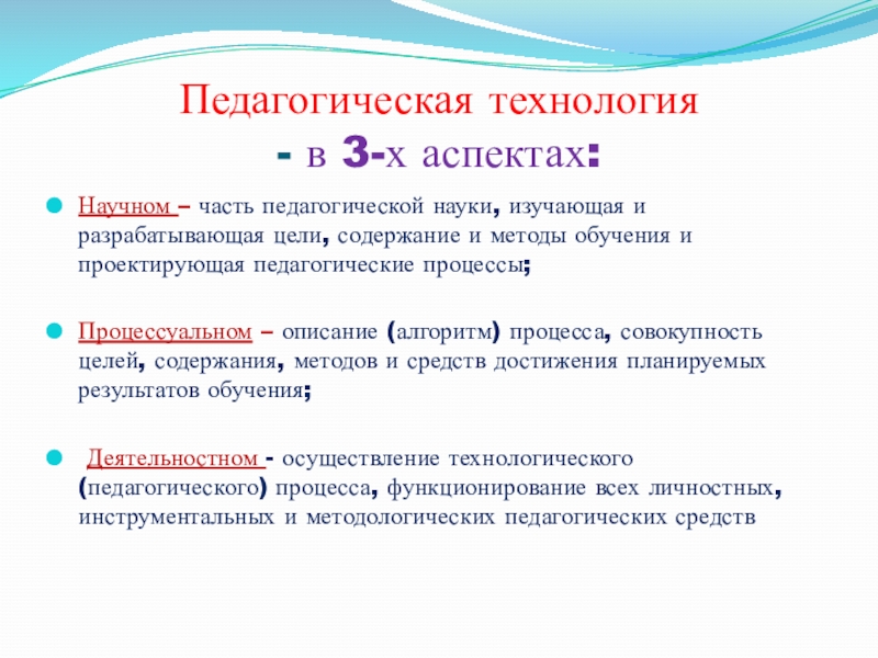 Процессуальном – описание (алгоритм) процесса, совокупность целей, содержания, методов и средств достижения планируемых результатов обучения;