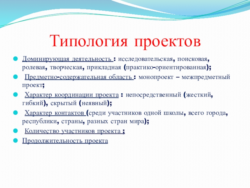 Доминирующая деятельность : исследовательская, поисковая, ролевая, творческая, прикладная (практико-ориентированная);