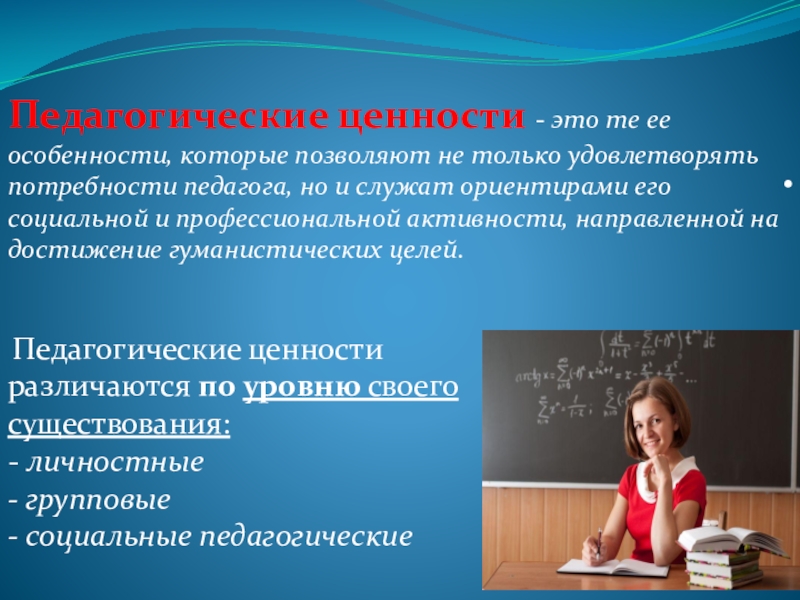 Педагогические ценности - это те ее особенности, которые позволяют не только удовлетворять потребности педагога, но и служат ориентирами его социальной и профессиональной активности, направленной на достижение гуманистических целей.