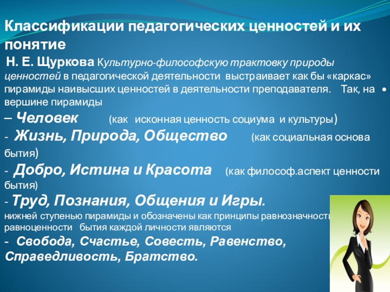 Щуркова Культурно-философскую трактовку природы ценностей в педагогической деятельности выстраивает как бы «каркас» пирамиды наивысших ценностей в деятельности преподавателя. Так, на вершине пирамиды