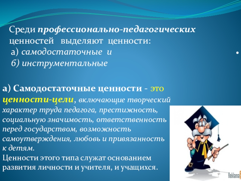 а) Самодостаточные ценности - это ценности-цели, включающие творческий характер труда педагога, престижность, социальную значимость, ответственность перед государством, возможность самоутверждения, любовь и привязанность