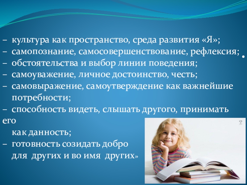 - чтобы нравственные ценности, созданные и завоеванные человечеством в прошлом и получившие расцвет в наши дни, стали духовным богатством каждого ребенка».