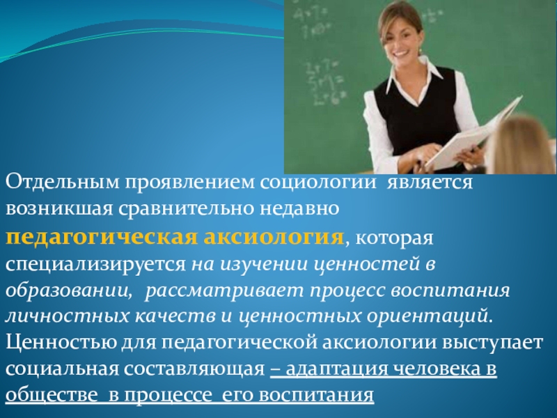 аксиология, которая специализируется на изучении ценностей в образовании, рассматривает процесс воспитания личностных качеств и ценностных ориентаций. Ценностью для педагогической аксиологии выступает социальная составляющая – адаптация человека в обществе в процессе его воспитания