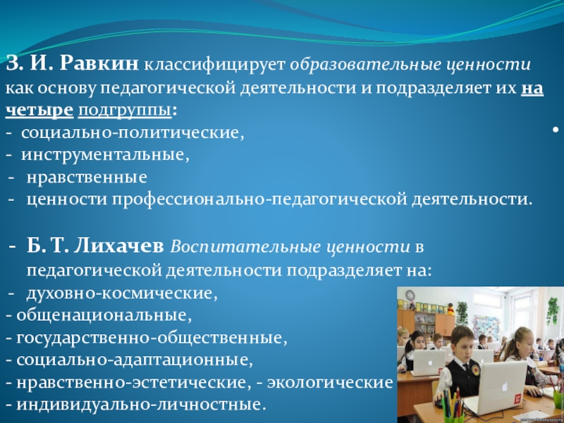 Б. Т. Лихачев Воспитательные ценности в педагогической деятельности подразделяет на: