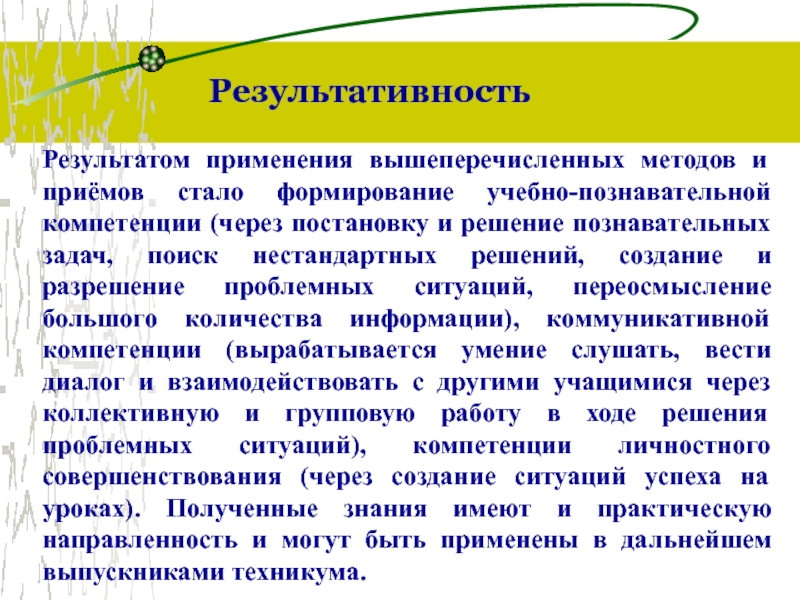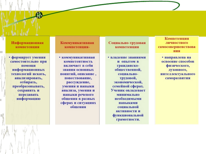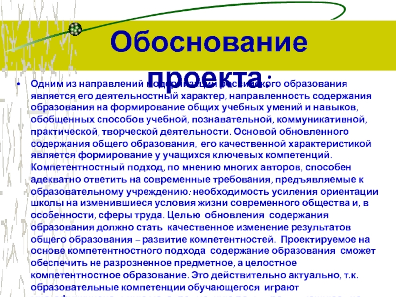 содержания образования на формирование общих учебных умений и навыков, обобщенных способов учебной, познавательной, коммуникативной, практической, творческой деятельности. Основой обновленного содержания общего образования, его качественной характеристикой является формирование у учащихся ключевых компетенций. Компетентностный подход, по мнению многих авторов, способен адекватно ответить на современные требования, предъявляемые к образовательному учреждению: необходимость усиления ориентации школы на изменившиеся условия жизни современного общества и, в особенности, сферы труда. Целью обновления содержания образования должно стать качественное изменение результатов общего образования – развитие компетентностей. Проектируемое на основе компетентностного подхода содержание образования сможет обеспечить не разрозненное предметное, а целостное компетентностное образование. Это действительно актуально, т.к. образовательные компетенции обучающегося играют многофункциональную метапредметную роль, проявляющуюся не только в школе, но и в семье, в общении с друзьями, в будущих производственных отношениях.