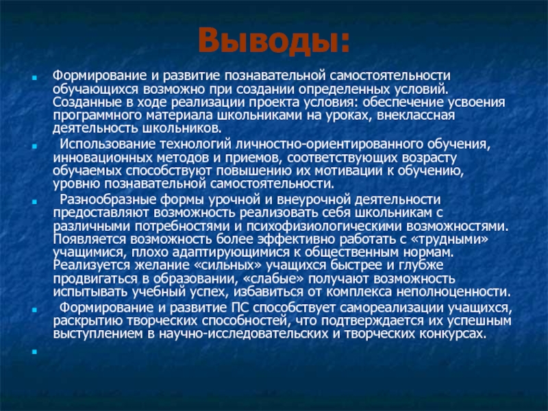 Формирование и развитие ПС способствует самореализации учащихся, раскрытию творческих способностей, что подтверждается их успешным выступлением в научно-исследовательских и творческих конкурсах.