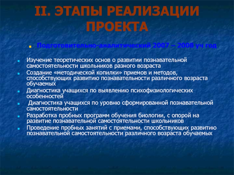 Слайд 10II. ЭТАПЫ РЕАЛИЗАЦИИ ПРОЕКТА