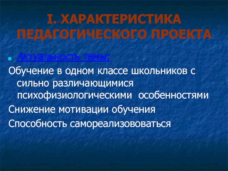 Слайд 3I. ХАРАКТЕРИСТИКА ПЕДАГОГИЧЕСКОГО ПРОЕКТА