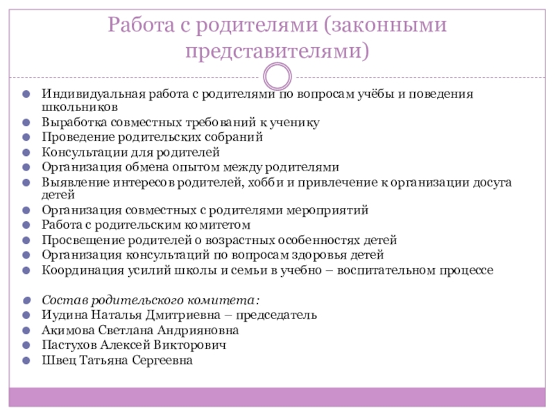 организует и проводит родительские собрания периодичностью 1-2 раза в четверть. Работает с родителями индивидуально, привлекает родителей к организации внеучебной деятельности;