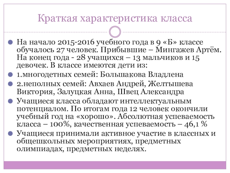 На начало 2015-2016 учебного года в 9 «Б» классе