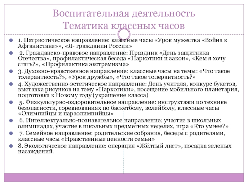 2. Гражданско-правовое направление: Праздник «День защитника Отечества», профилактическая беседа «Наркотики и закон», «Кем я хочу стать?», «Профилактика экстремизма»