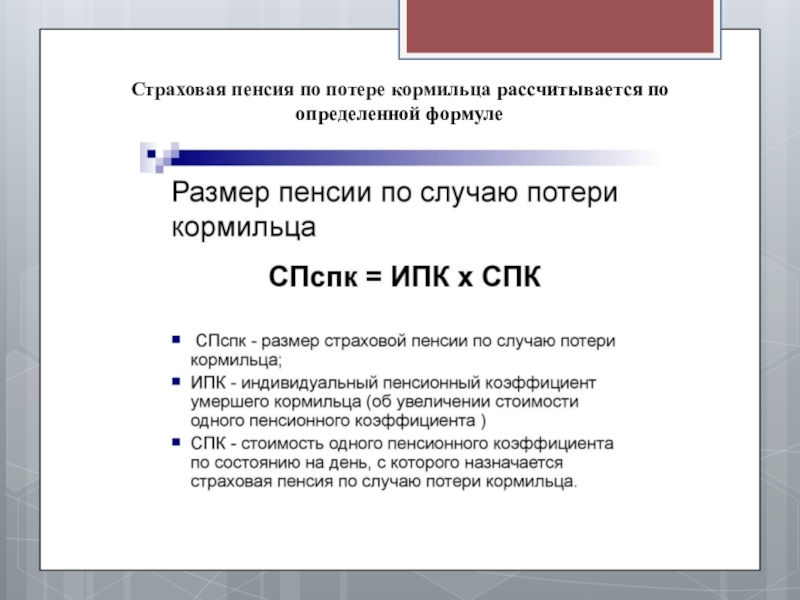 Слайд 8Страховая пенсия по потере кормильца рассчитывается по определенной формуле
