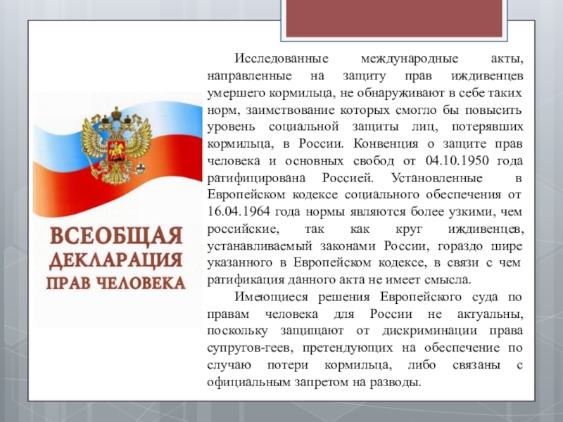 обнаруживают в себе таких норм, заимствование которых смогло бы повысить уровень социальной защиты лиц, потерявших кормильца, в России. Конвенция о защите прав человека и основных свобод от 04.10.1950 года ратифицирована Россией. Установленные в Европейском кодексе социального обеспечения от 16.04.1964 года нормы являются более узкими, чем российские, так как круг иждивенцев, устанавливаемый законами России, гораздо шире указанного в Европейском кодексе, в связи с чем ратификация данного акта не имеет смысла.