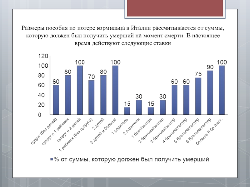 Слайд 15Размеры пособия по потере кормильца в Италии рассчитываются от суммы, которую
