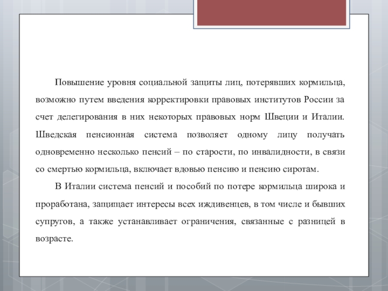 Слайд 14Повышение уровня социальной защиты лиц, потерявших кормильца, возможно путем введения корректировки