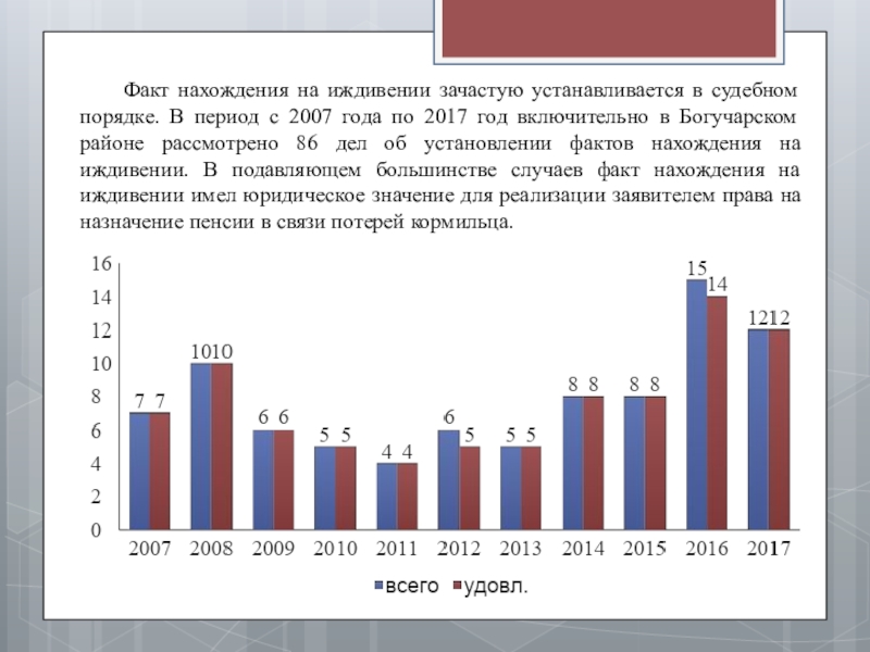 с 2007 года по 2017 год включительно в Богучарском районе рассмотрено 86 дел об установлении фактов нахождения на иждивении. В подавляющем большинстве случаев факт нахождения на иждивении имел юридическое значение для реализации заявителем права на назначение пенсии в связи потерей кормильца.