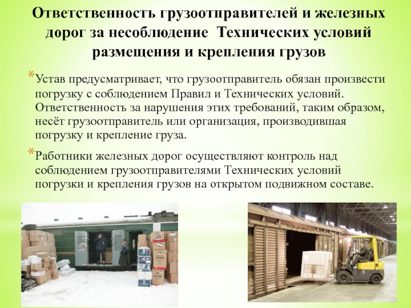 Ответственность грузоотправителей и железных дорог за несоблюдение Технических условий размещения и крепления грузов;