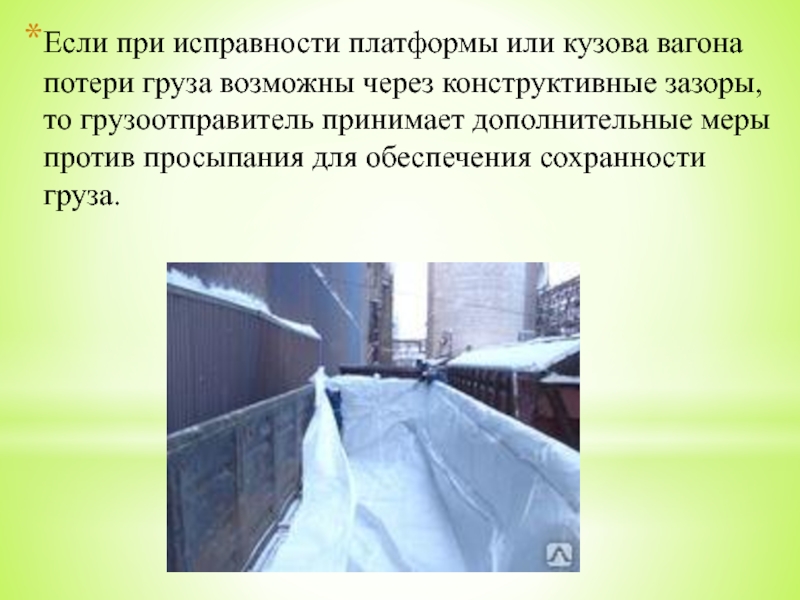 Слайд 11Если при исправности платформы или кузова вагона потери груза возможны через