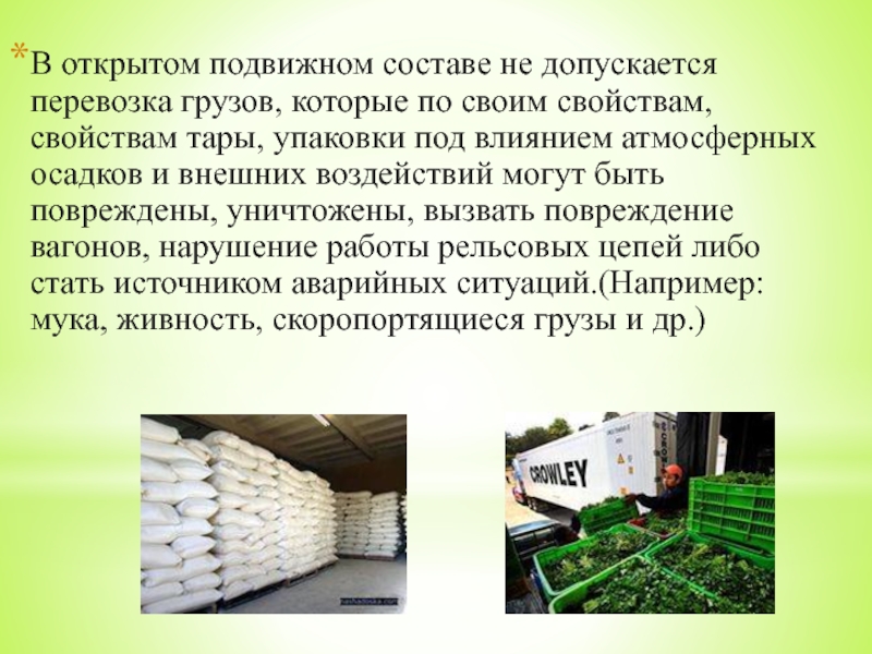 Слайд 5В открытом подвижном составе не допускается перевозка грузов, которые по своим