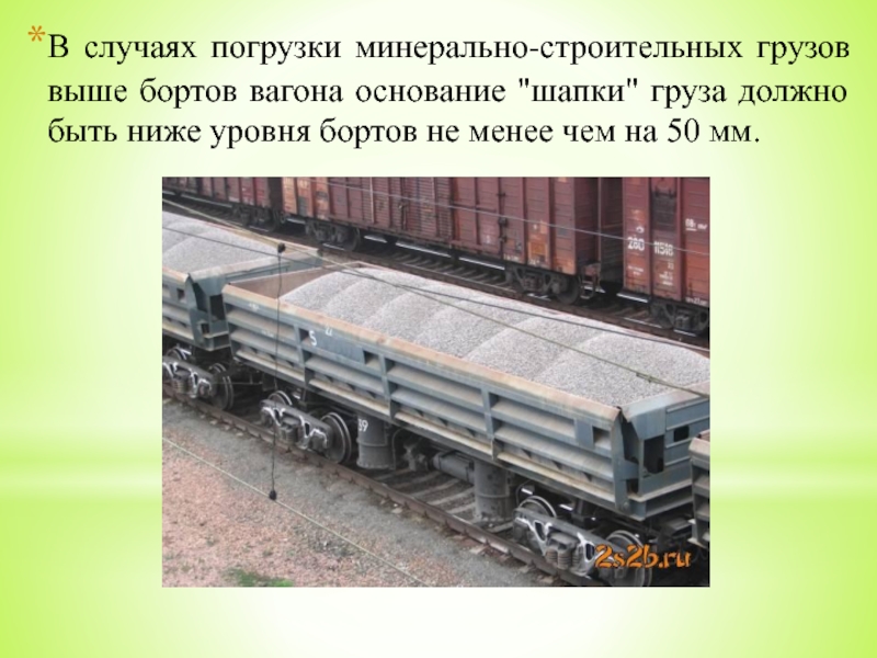 Слайд 12В случаях погрузки минерально-строительных грузов выше бортов вагона основание "шапки" груза
