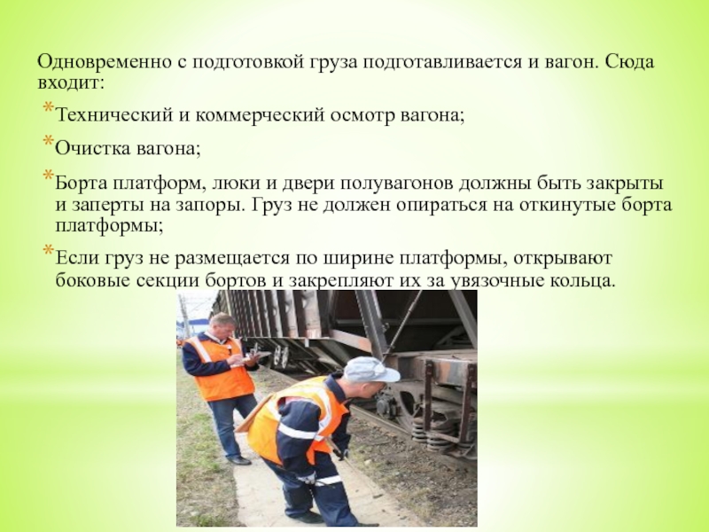 Слайд 16Одновременно с подготовкой груза подготавливается и вагон. Сюда входит: