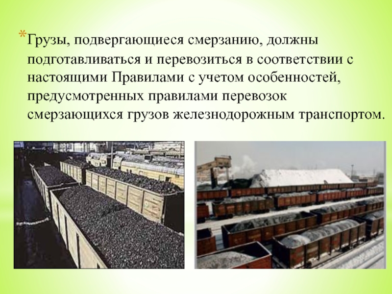 Слайд 13Грузы, подвергающиеся смерзанию, должны подготавливаться и перевозиться в соответствии с настоящими