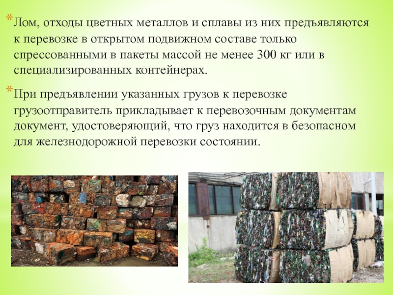 Слайд 9Лом, отходы цветных металлов и сплавы из них предъявляются к перевозке