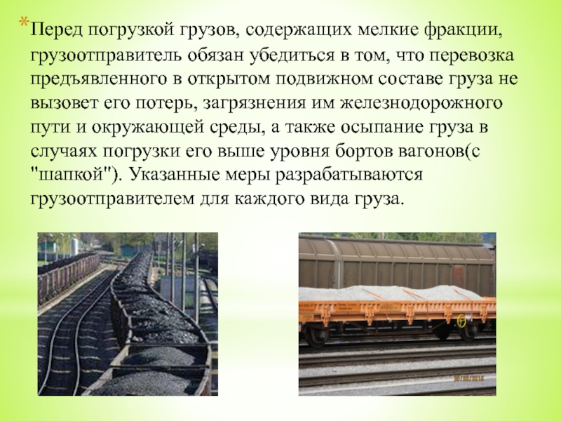 Слайд 10Перед погрузкой грузов, содержащих мелкие фракции, грузоотправитель обязан убедиться в том,
