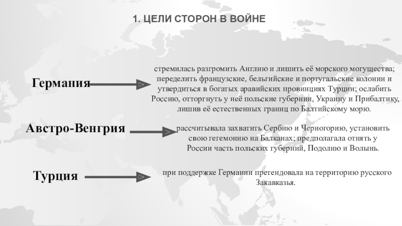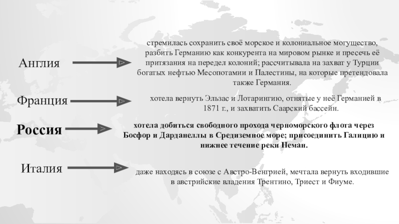 стремилась сохранить своё морское и колониальное могущество, разбить Германию как конкурента на мировом рынке и пресечь её притязания на передел колоний; рассчитывала на захват у Турции богатых нефтью Месопотамии и Палестины, на которые претендовала также Германия.