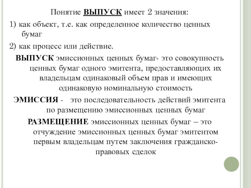Понятие ВЫПУСК имеет 2 значения:1) как объект, т.е. как определенное количество ценных бумаг2) как процесс или действие.ВЫПУСК